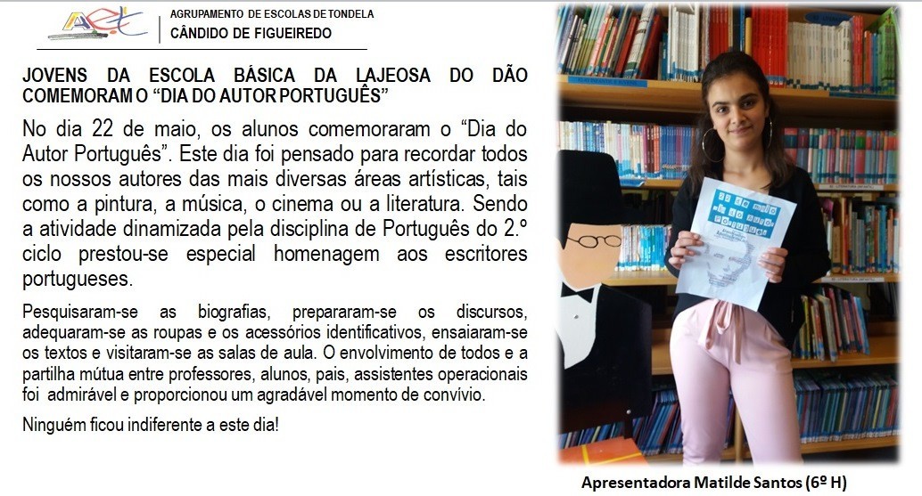 No dia 22 de maio, os alunos comemoraram o “Dia do Autor Português”. Este dia foi pensado para recordar todos os nossos autores das mais diversas áreas artísticas, tais como a pintura, a música, o cinema ou a literatura. Sendo a atividade dinamizada pela disciplina de Português do 2.º ciclo prestou-se especial homenagem aos escritores portugueses.
